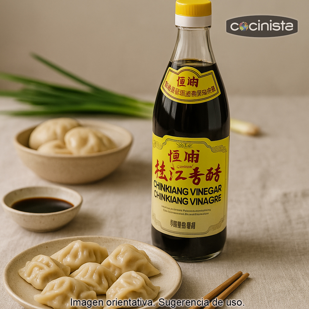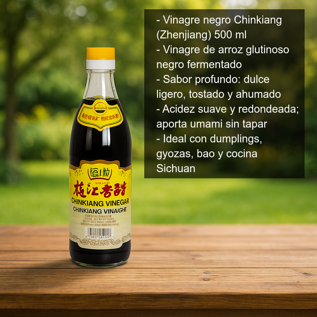 Es el acompañamiento clásico para dumplings (jiaozi), gyozas, bao y otros platos cocinados al vapor, y también se utiliza ampliamente en recetas tradicionales chinas y de inspiración Sichuan. Si buscas un vinagre con carácter para dar profundidad a tus platos, el Chinkiang es una elección muy versátil.