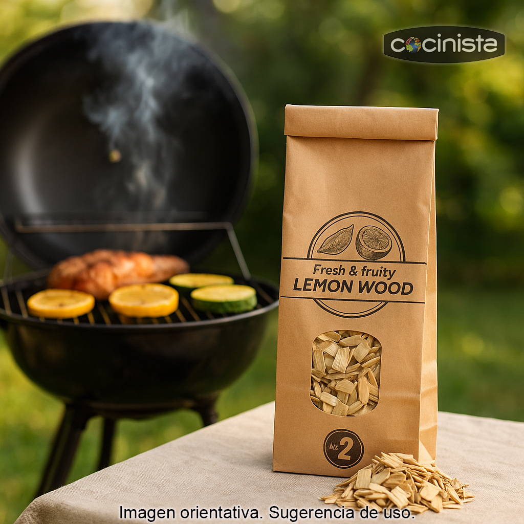La viruta de limonero está pensada para usarse en barbacoa de carbón o de gas (con caja ahumadora o paquete de aluminio) y también es muy útil para aromatizar cocciones indirectas. Su tamaño facilita una combustión controlada y una liberación progresiva del humo.