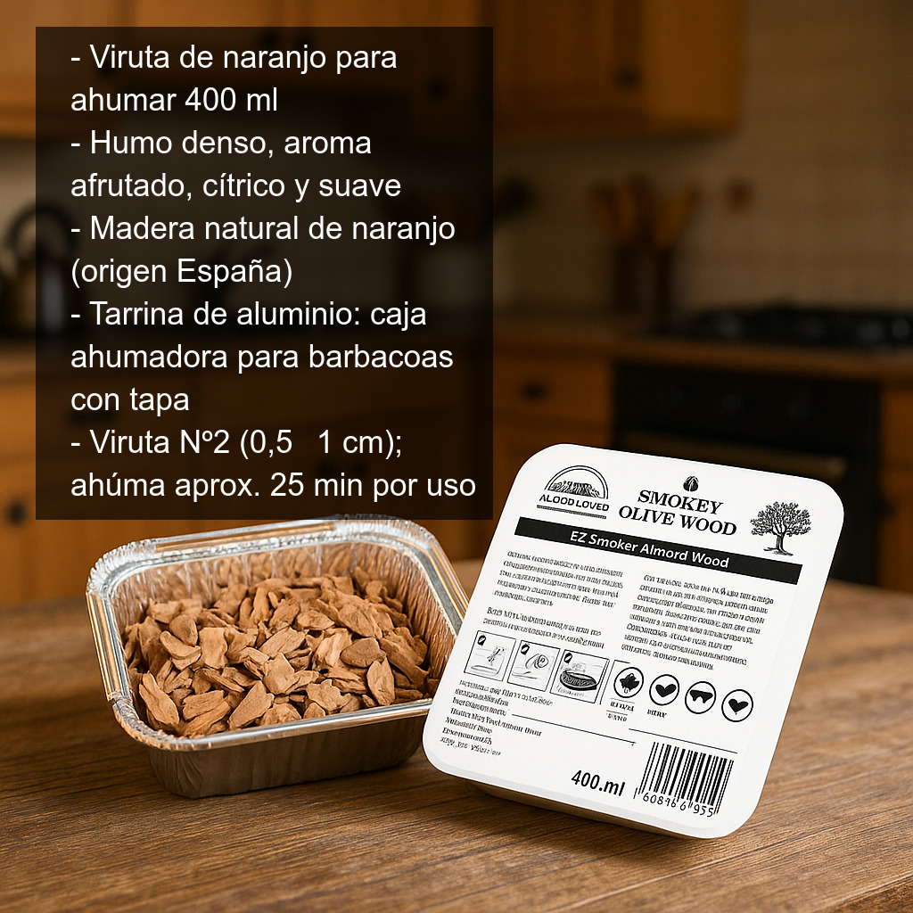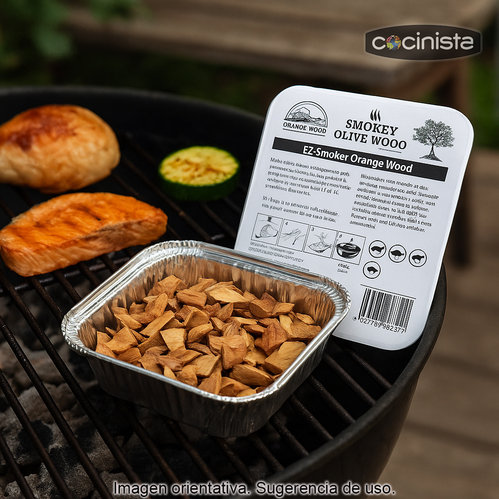 La viruta de madera de naranjo para ahumar (bandeja de 400 ml) es una opción ideal para dar a tus recetas un toque aromático diferente: un humo denso con un perfil afrutado y cítrico característico del naranjo. Elaborada con madera natural, está pensada para aportar sabor y aroma sin enmascarar el producto, realzando especialmente carnes blancas, pescados y verduras.