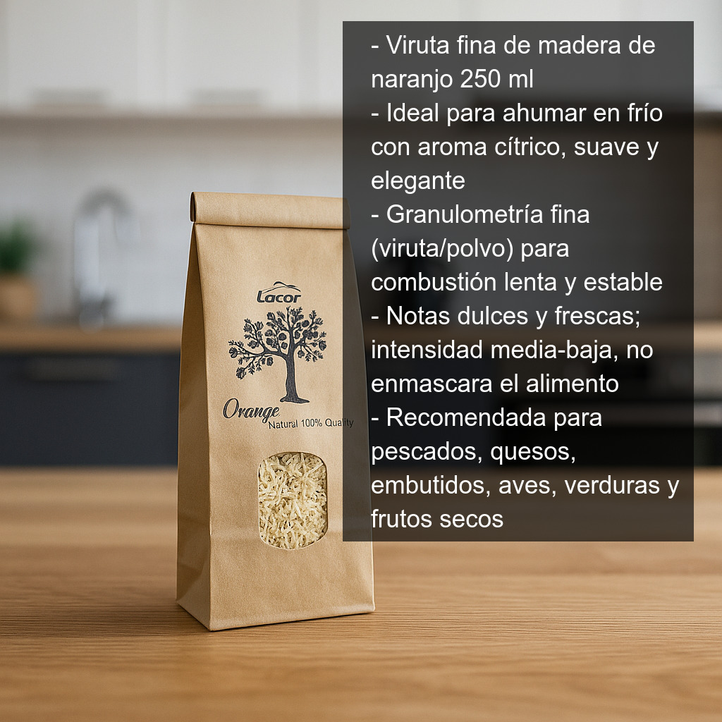 Viruta muy fina de madera de naranjo (formato 250 ml), ideal para ahumar en frío y aportar a tus elaboraciones un aroma cítrico, suave y elegante. La madera de naranjo es especialmente apreciada para conseguir un ahumado delicado, con notas dulces y frescas que no enmascaran el sabor del alimento, sino que lo realzan.
