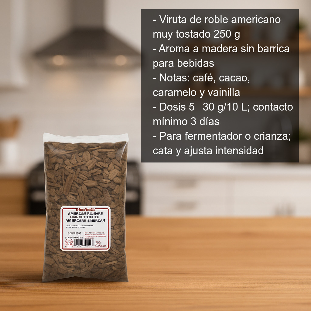 Consigue en casa un auténtico aroma a madera en tus elaboraciones sin necesidad de barricas: la viruta de roble americano muy tostado (250 g) es una opción práctica y controlable para aportar notas intensas de tostado a vino, cerveza, sidra, hidromiel o destilados en maceración. Solo tienes que añadir las virutas a tu fermentador (plástico o metal) o al recipiente de crianza y dejar que el roble haga su trabajo.