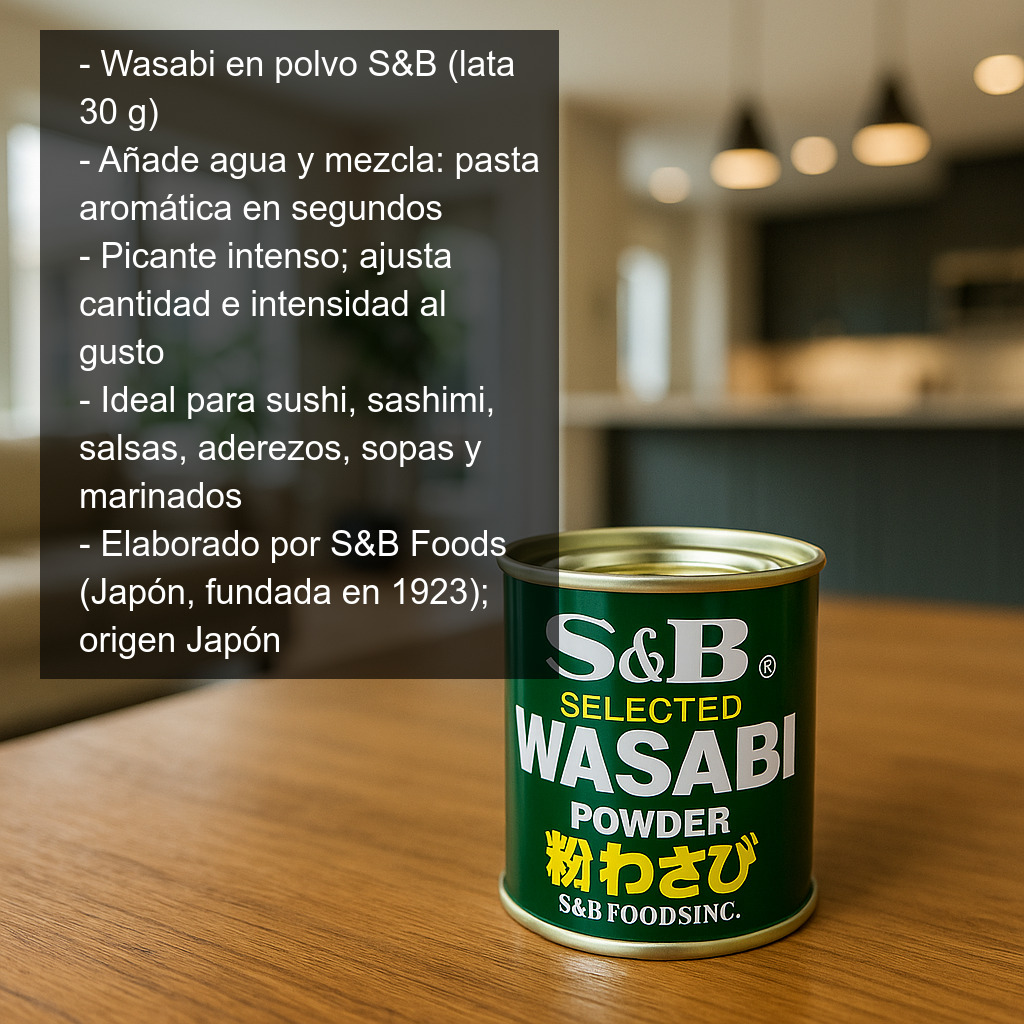 El wasabi en polvo S&B es un práctico preparado en lata que te permite obtener, en segundos, una pasta de wasabi aromática y de picante intenso para acompañar sushi, sashimi y muchas otras recetas japonesas. Solo tienes que añadir unas gotas de agua y mezclar para conseguir la textura perfecta.