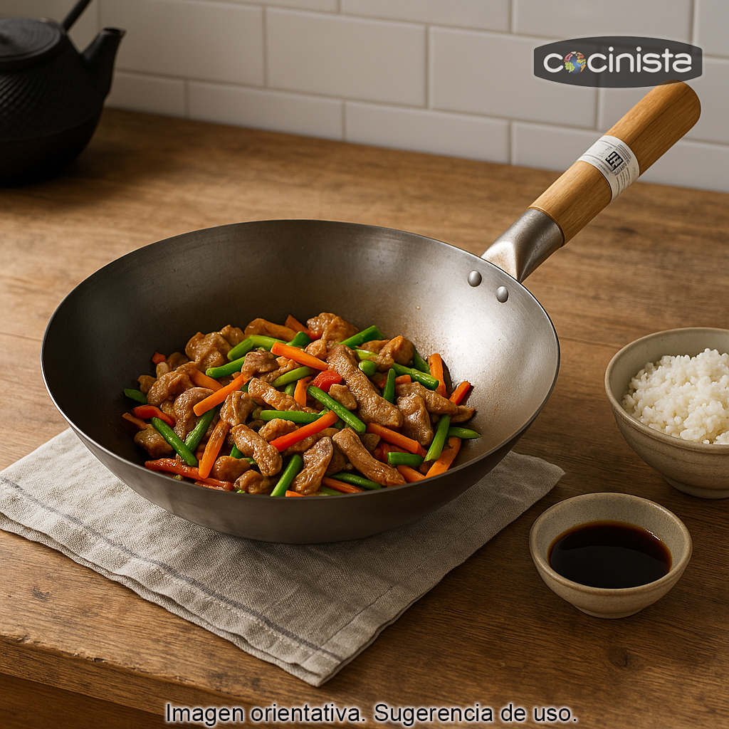 Este wok de 33 cm fabricado en acero con mango de madera es una pieza pensada para quienes buscan un wok asiático tradicional, sin recubrimientos antiadherentes y con la forma adecuada para trabajar con fuego vivo. A diferencia del wok ref. 11071, este modelo incorpora un mango de madera más largo, que mejora el agarre y aporta mayor comodidad y seguridad al cocinar, especialmente cuando se saltea a alta temperatura.