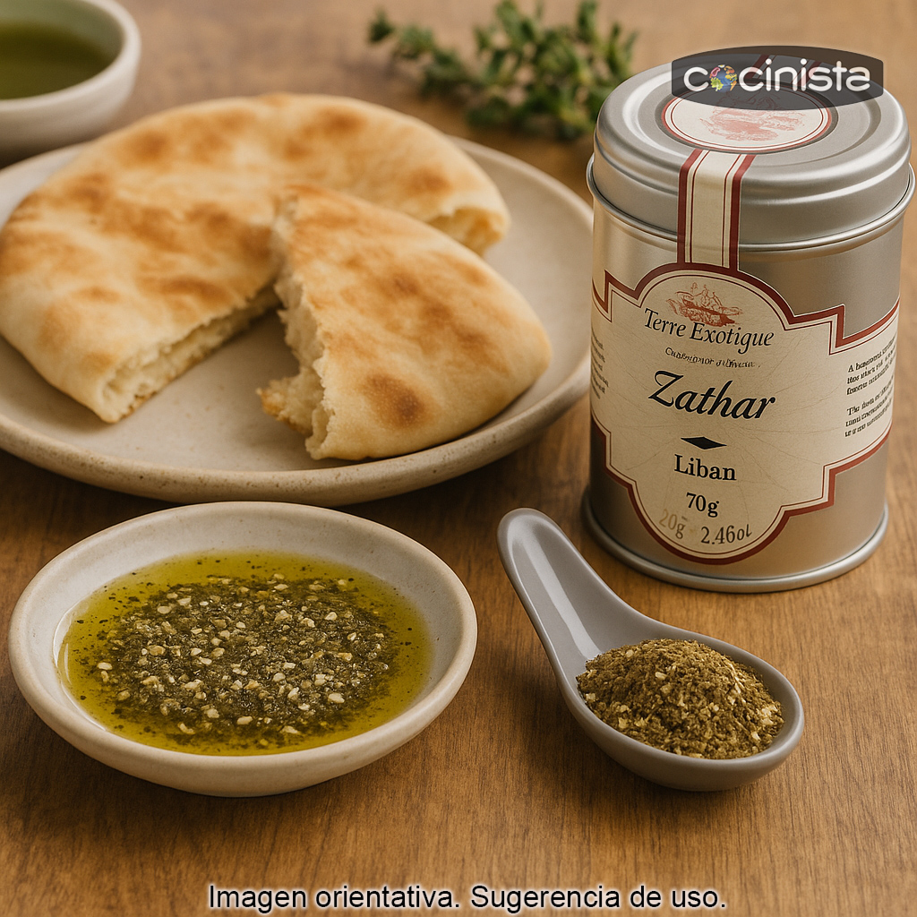 En Líbano y otros países del Mediterráneo oriental se disfruta de forma tradicional mezclado con aceite de oliva virgen extra y servido con pan de pita (o pan plano), ideal para desayunos y aperitivos. Pero su uso va mucho más allá: es excelente para marinar, espolvorear y terminar platos justo antes de servir, aportando aroma y un punto fresco y ligeramente cítrico.